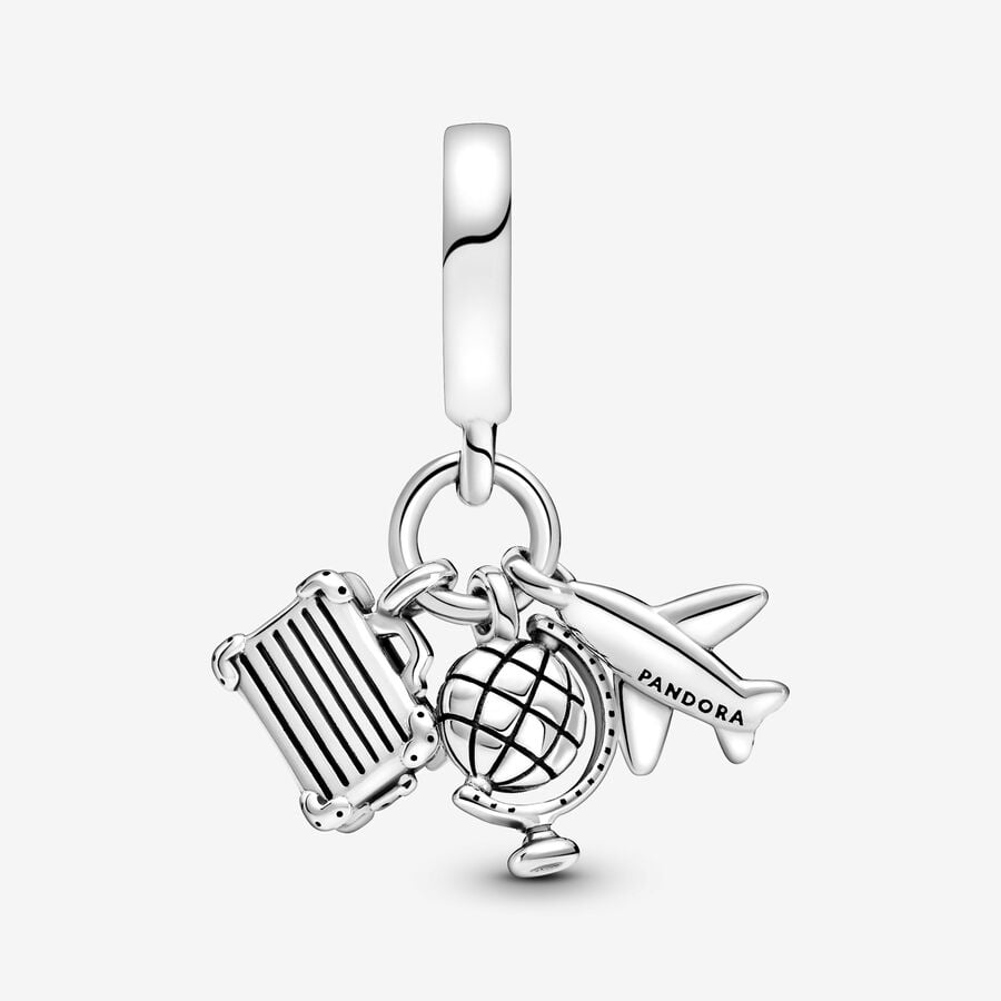 Prepare to embark on your next journey and enhance your collection with the Airplane, Globe & Suitcase Dangle Charm. This versatile charm combines three symbols of wanderlust in sterling silver, making it a must-have for travel enthusiasts. Delicate features such as the airplane's grooved windows, the globe's longitude and latitude lines, and a charming pink enamel heart adorning the suitcase add exquisite detail. Whether you're committing to future adventures or presenting it as a thoughtful gift to your jet-setting best friend, this travel charm promises to inspire wanderlust and cherished memories.