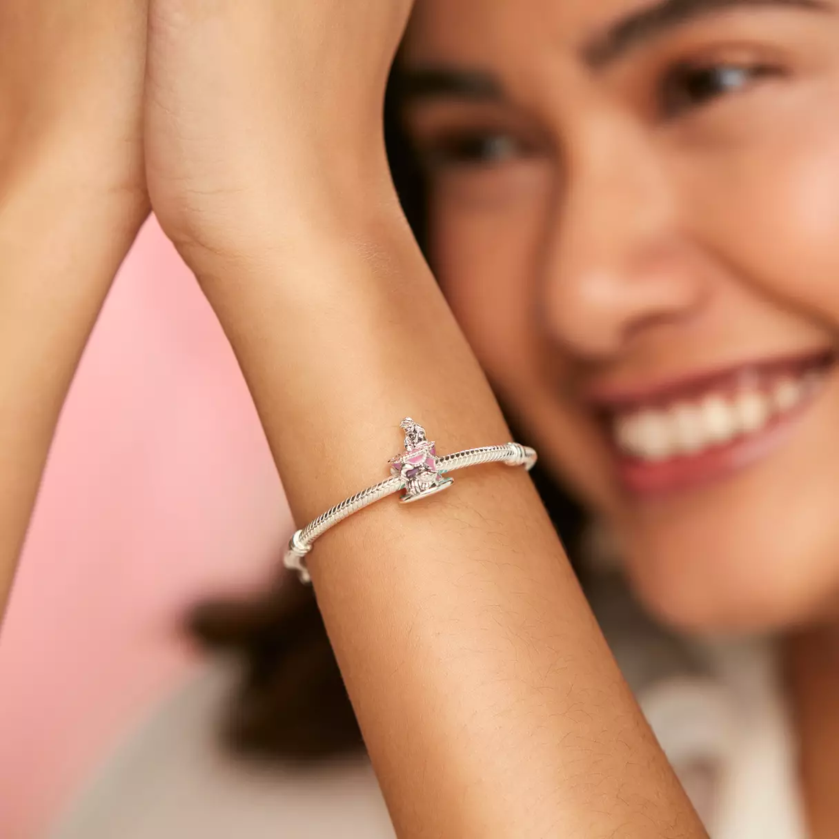 This intricately designed sterling silver hat is adorned with pink and blue enamel, resembling a delightful cake inspired by the "unbirthday" celebration from Alice's whimsical adventure. One side features a miniature figure of Alice, while the other showcases the ever-enigmatic Cheshire Cat, bringing a touch of magic and wonder to this charming piece.