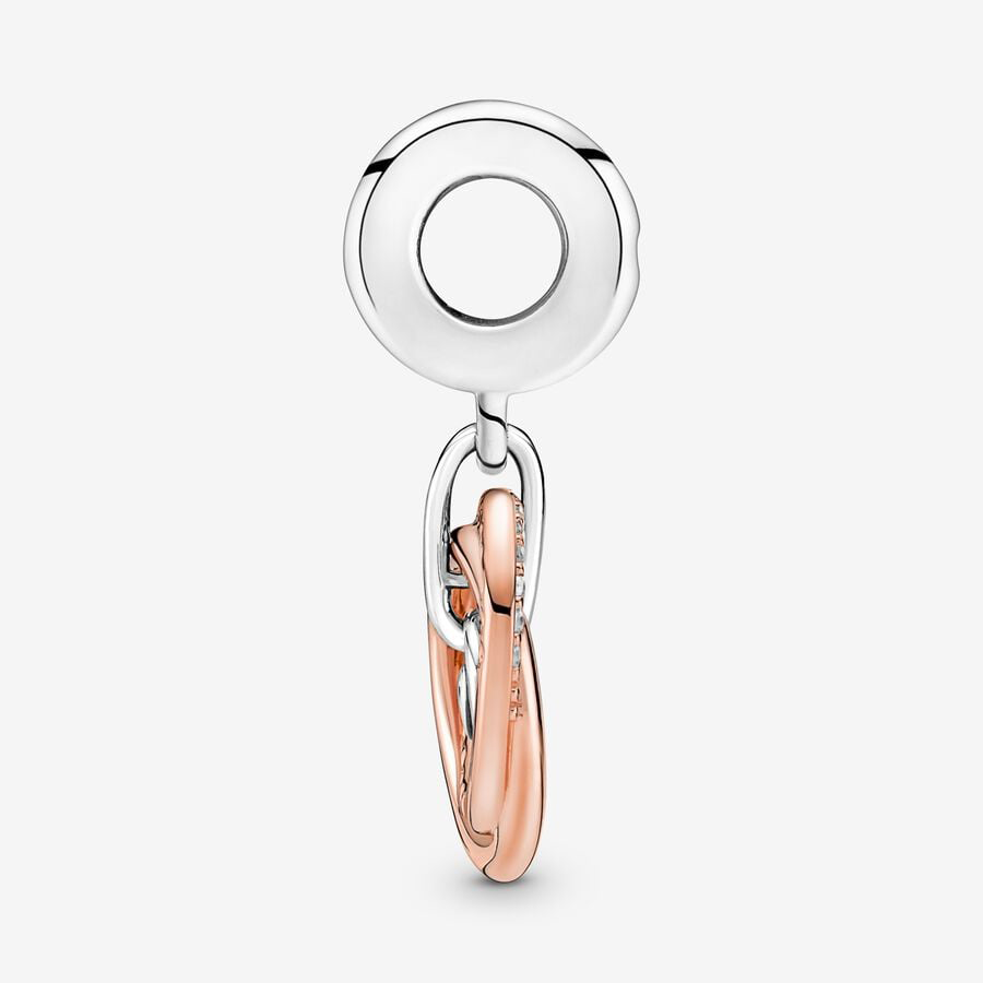 Representing enduring love, the Family Forever Linked Dangle Charm showcases two intertwined circles plated in 14k rose gold, with one adorned by sparkling cubic zirconia pavé. Hanging from the bail, a sterling silver disc bears the inscription "Always Together." This charm celebrates the unity within families, embodying the blend of individuality and togetherness.