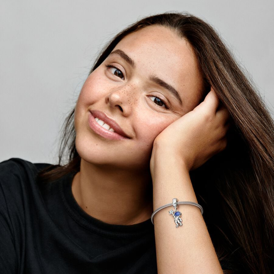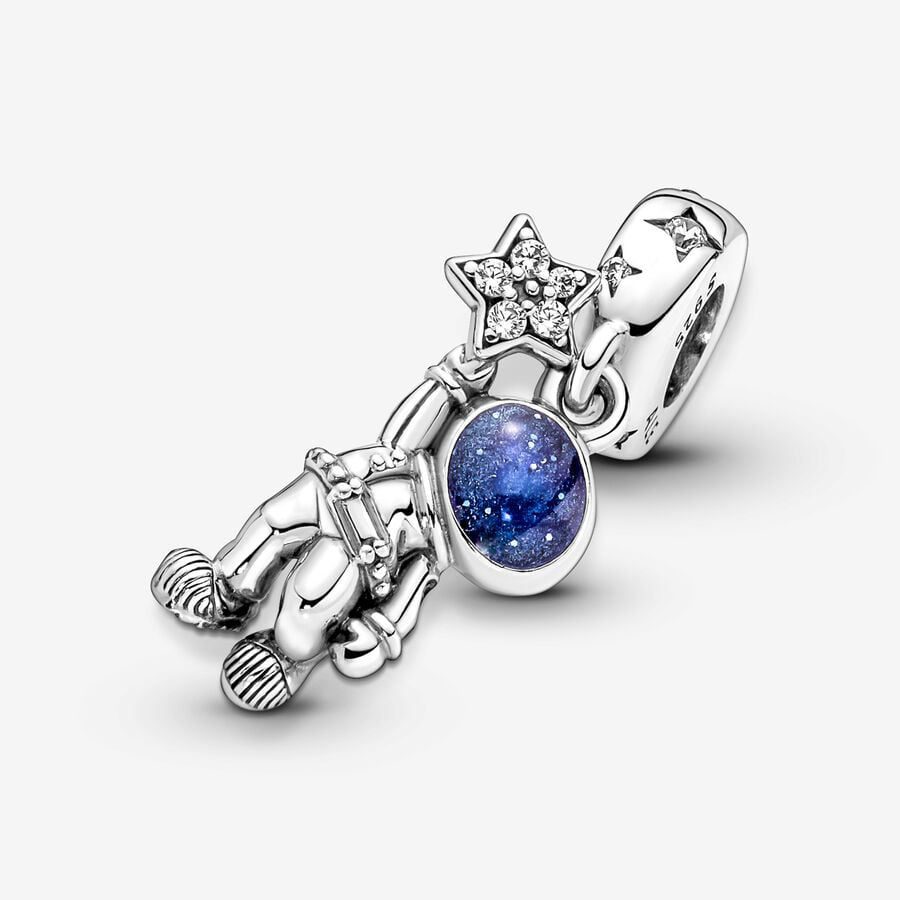 Discover the wonders of the galaxy with the Astronaut In The Galaxy Dangle Charm. Crafted in sterling silver, this charm features a space explorer's suit adorned with microbeads, with a clear cubic zirconia stone serving as the oxygen tank. The helmet visor shines with blue enamel, while a cut-out heart on the astronaut's arm is accented with a sparkling stone. In one hand, the astronaut holds a dazzling star set with clear cubic zirconia. This celestial charm is a gentle reminder to always aim for the stars.