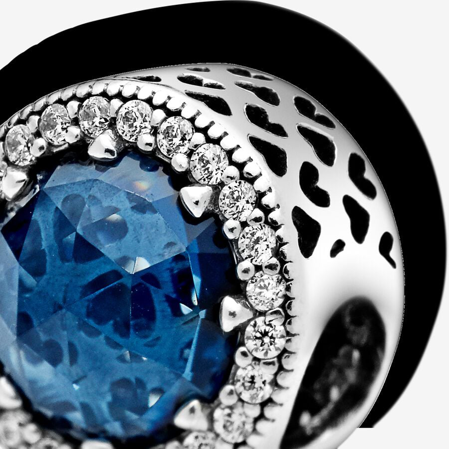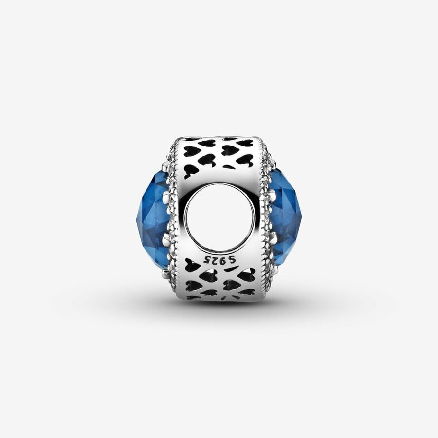 Illuminate the evening with this Blue Crystal Charm. Meticulously fashioned in high-quality silver, it features a shimmering deep blue crystal encircled by meticulously set cubic zirconia stones. Intricate heart-shaped cut-outs on its sides add to its allure. Pair it with silver charms on a chain bracelet for a stylish look, or let it shine solo as a captivating pendant on a necklace chain.