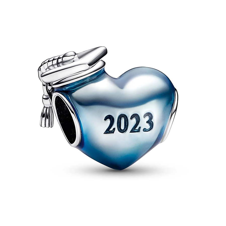 Bid farewell to the academic year with this enchanting charm. Ideal for commemorating accomplishments and cherished friendships, this charm serves as a delightful token for a school leaver or graduate. Fashioned in sterling silver, a heart-shaped adornment is adorned with a stylish blue enamel coating and etched with "2023". Resting atop the heart is a graduation cap, providing a charming touch to this keepsake.