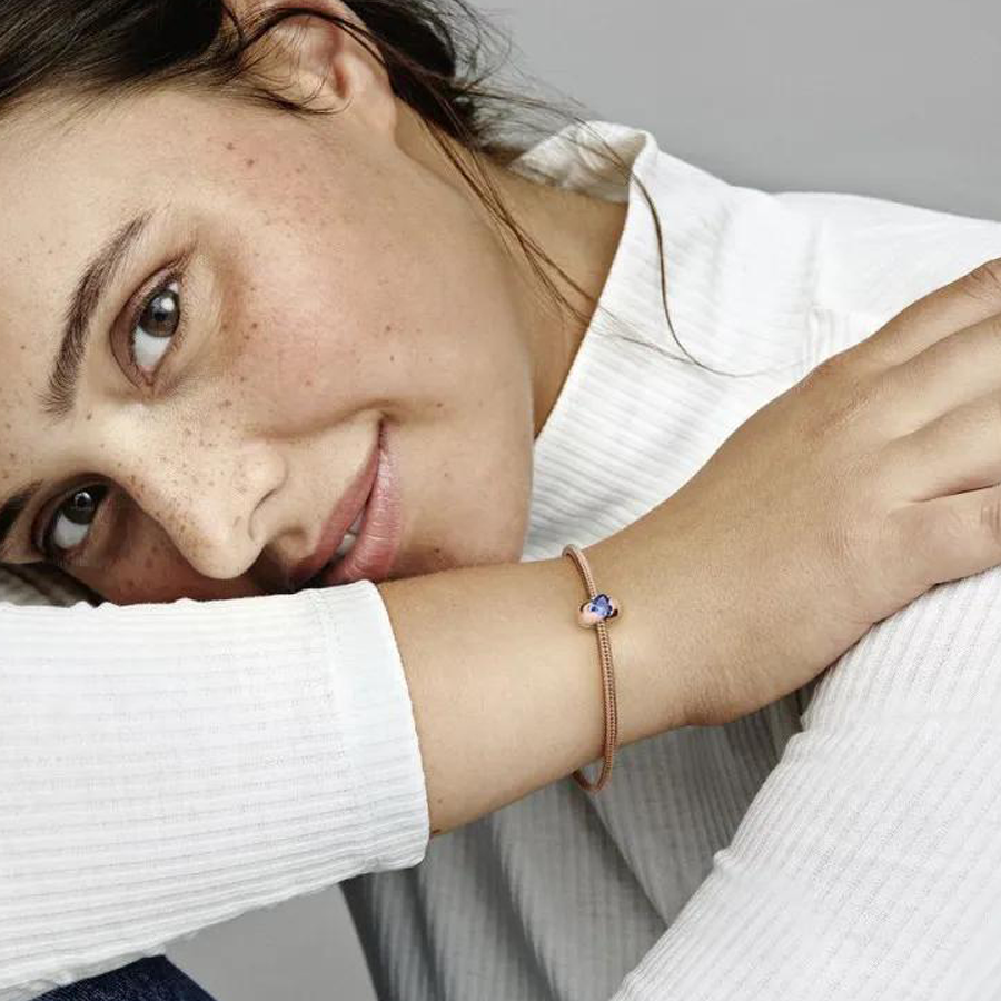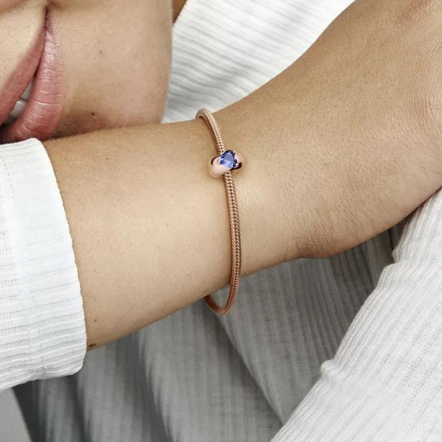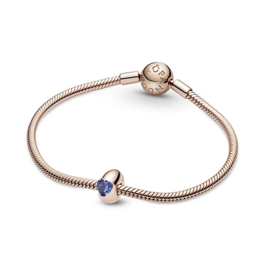 Enhance your style with the Blue Heart Rose Gold Clip Charm. Crafted with care in 14k rose gold plating, this charm draws inspiration from the elegance of solitaire rings. Adorned with a prominent heart-shaped stone, it complements a spectrum of colorful charms on your preferred bracelet for a statement that reflects your confidence. Equipped with a silicone grip, this clip charm seamlessly integrates onto your bracelet without needing threads. Versatile in placement, it adds a touch of sophistication wherever you choose to style it.