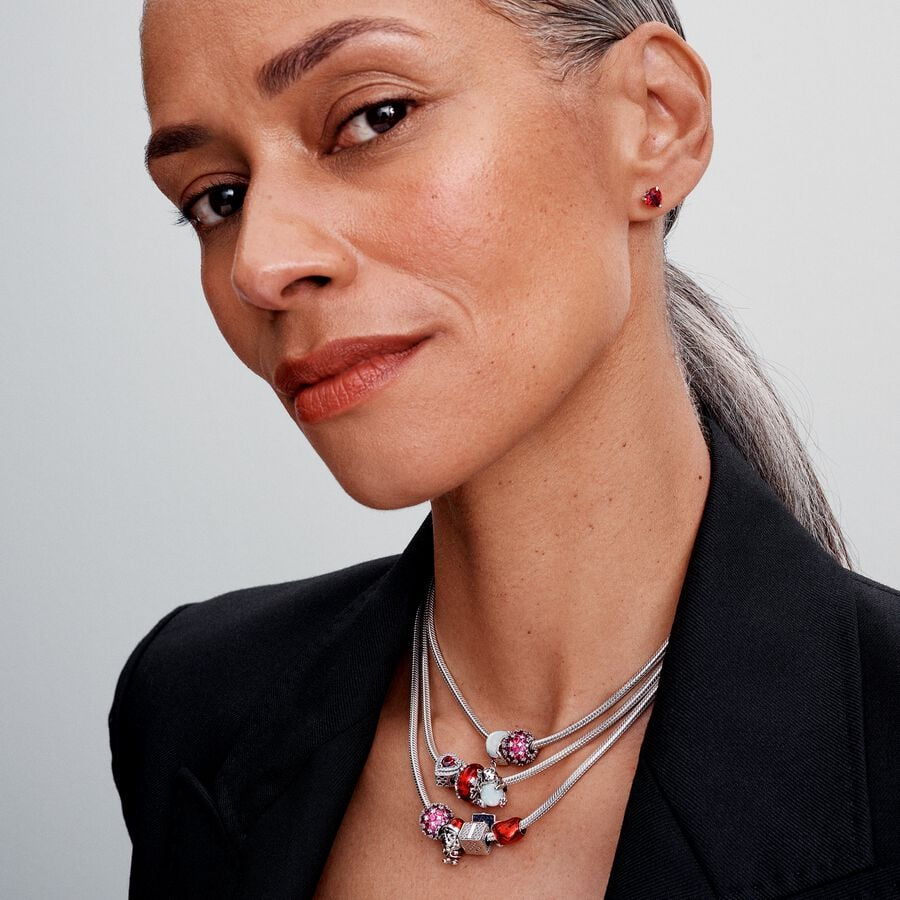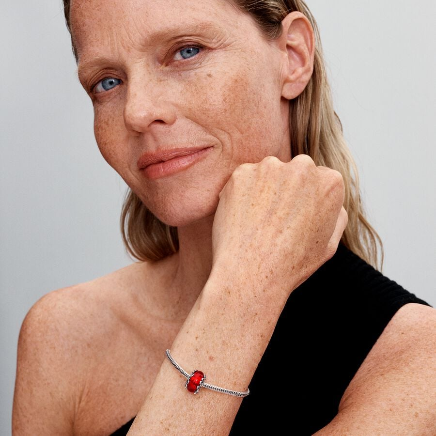 Embrace the holiday spirit with our Christmas Magic Murano Glass Charm. This stunning charm features a rich red Murano glass core, adorned with a layer of golden foil that creates a captivating warm glow. Delicately crafted in sterling silver, festive motifs like Christmas trees, gingerbread men, and candy cane hearts wrap around the charm, adding a playful touch of seasonal cheer.