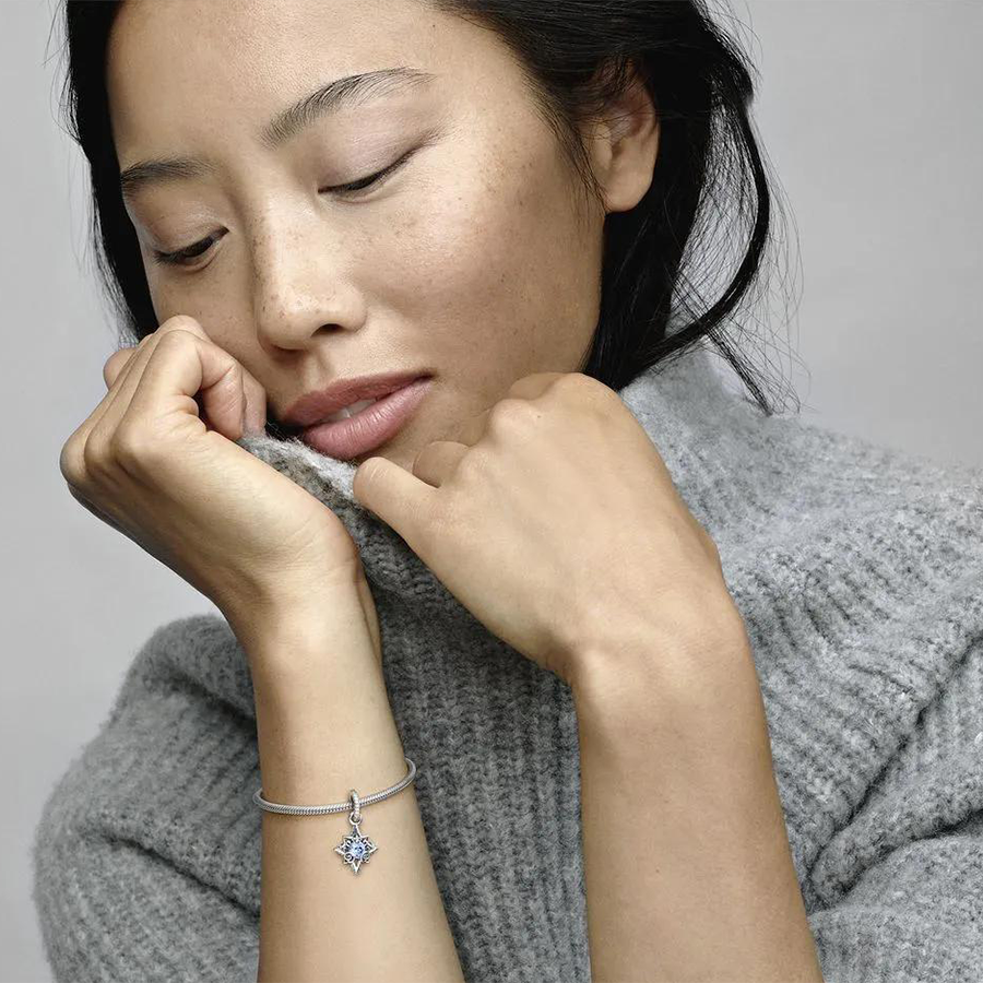 Infuse your style with princess-inspired allure through the Cinderella Blue Star Charm. Crafted in sterling silver, this pendant showcases a sizable light blue cubic zirconia at its core, encircled by an asymmetrical star design. Adorned with intricate beading, swirls, and a cut-out pumpkin carriage motif on the reverse, it draws inspiration from Cinderella's timeless elegance and narrative. Elevate your ensemble with a touch of majestic sparkle reminiscent of royalty.