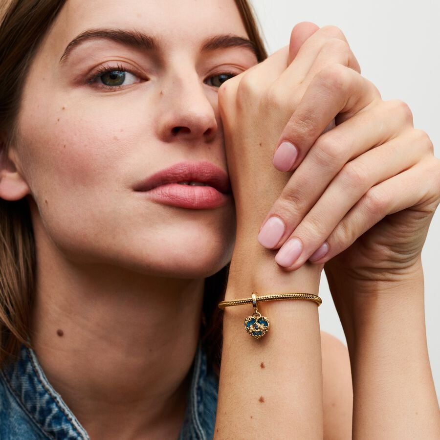 Add a touch of magic to your day with the Disney Cinderella's Carriage & Heart Double Dangle Charm. Inspired by the timeless story of Cinderella, this charm is plated in 14k gold and features two heart-shaped discs. One showcases Cinderella's enchanting carriage in delicate openwork, with a blue marquise-shaped stone at its center. The second heart-shaped disc behind it is adorned with shimmering blue enamel, and the back is engraved with the heartfelt message, "A Dream is a wish your heart makes." Perfect for adding to your favorite necklace, bracelet, or charm holder, this piece serves as a beautiful reminder to always follow your dreams.