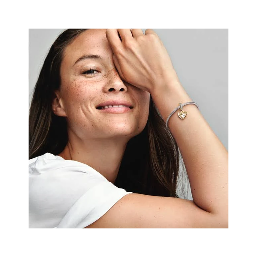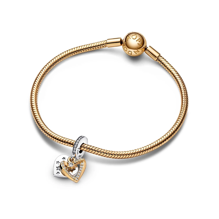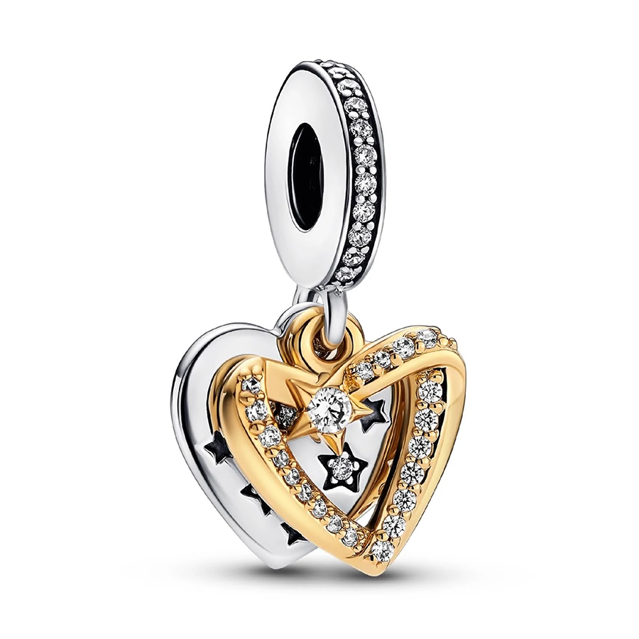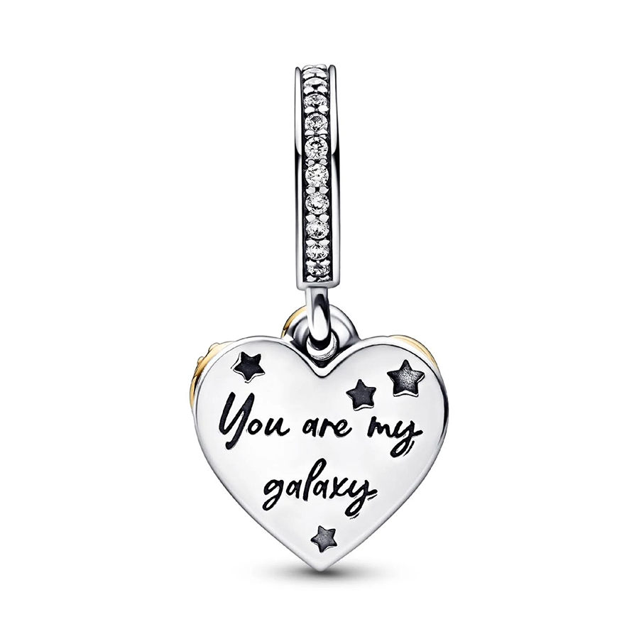 Elevate Valentine's Day with our Shooting Star Hearts Double Dangle Charm, adding a celestial touch to romance. This exquisite charm boasts a two-tone design, with a 14k gold-plated heart adorned with a constellation of dazzling stars. The accompanying sterling silver heart bears the touching inscription: "You are my galaxy," serving as a radiant testament to boundless love.