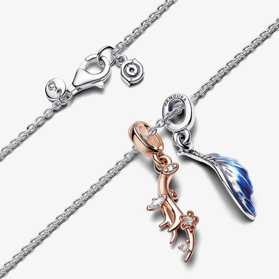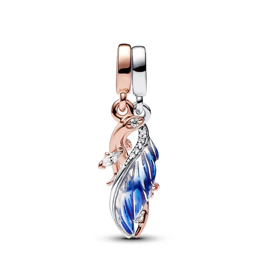 This elegant double charm features a beautiful combination of a delicate blue feather and a branching rosegold charm, both adorned with sparkling accents. Crafted from high-quality sterling silver, the intricate detailing of the feather adds a touch of nature's grace, while the rosegold charm exudes warmth and love. The charm’s design allows it to effortlessly complement a variety of bracelet styles, adding a shimmering and meaningful touch to any look. Ideal for those who appreciate a blend of elegance and sentimentality, this charm makes a perfect gift or personal accessory.
