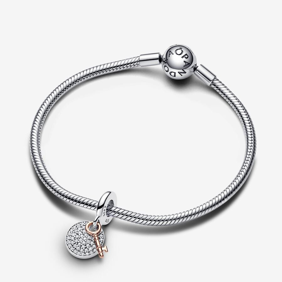 Unlock joy with the Two-tone Key To Happiness Double Dangle Charm. Crafted from sterling silver and featuring 14k rose gold plating, this two-tone charm includes a round disc adorned with sparkling details. Engraved with "FAMILY is the key to happiness" on the polished side, it flips to reveal a textured, light-reflecting pavé design. The key, plated in 14k rose gold, swings freely, symbolizing the unbreakable bond of family. Let this heartfelt piece be a reminder that true happiness is found in the company of loved ones.