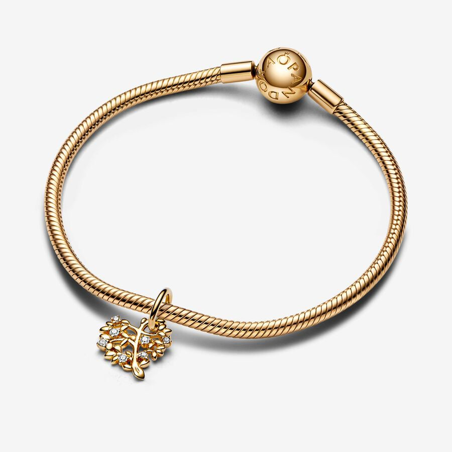 Celebrate your affection for your family with this exquisite and meaningful charm. The Sparkling Heart & Family Tree Dangle Charm features a heart-shaped family tree design crafted from 14k gold-plated silver. It is adorned with dazzling cubic zirconia stones, enhancing its branches and leaves. Symbolizing enduring connections and unwavering support, the family tree serves as a poignant representation of profound love for your family and community.