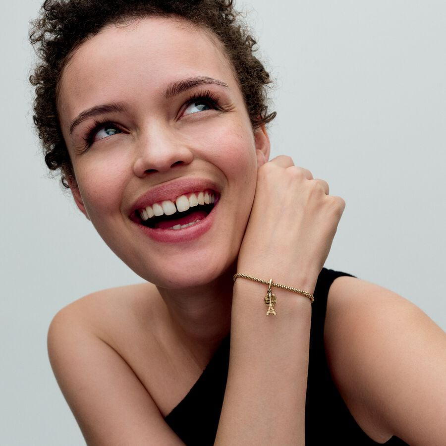Take a piece of Paris with you wherever you go with this intricately detailed charm featuring a replica of the iconic Eiffel Tower. A sparkling stone adorns the top of the tower, while a second dangle showcases a disc engraved with "Paris,". Designed to celebrate the 2024 Olympics in Paris, this charm adds a touch of French elegance to your style.