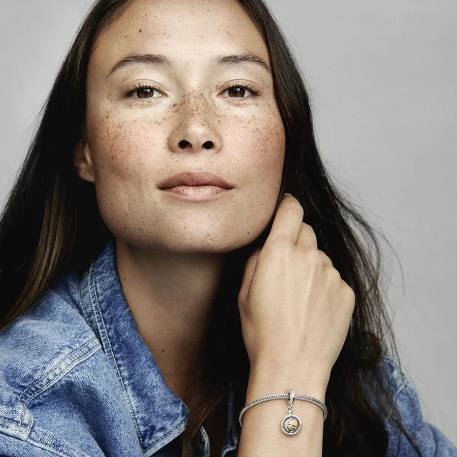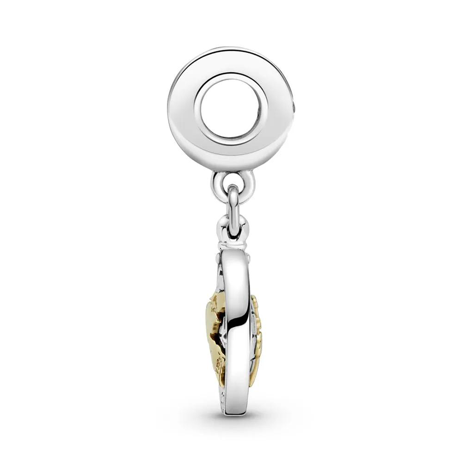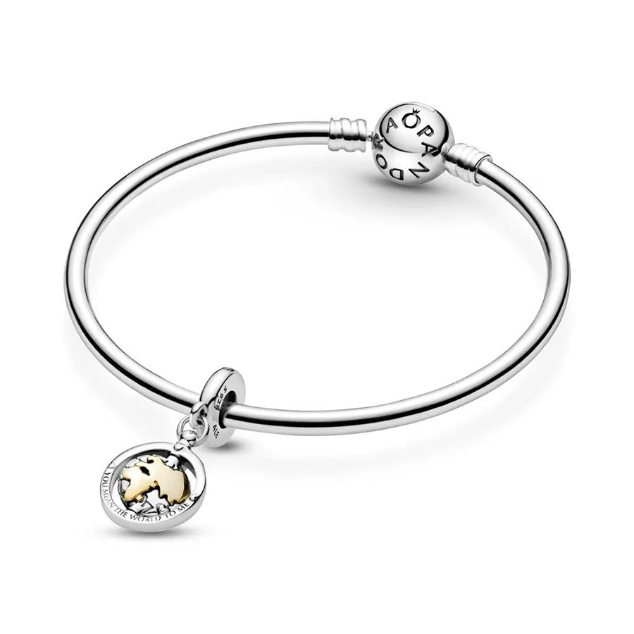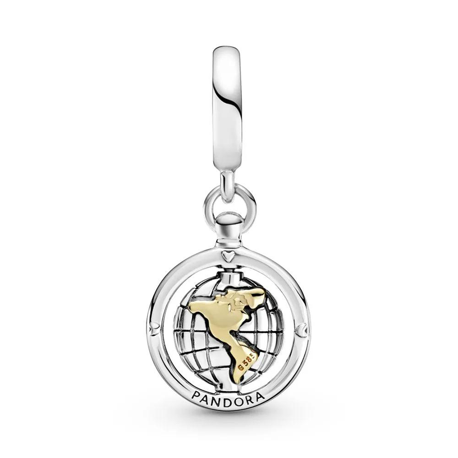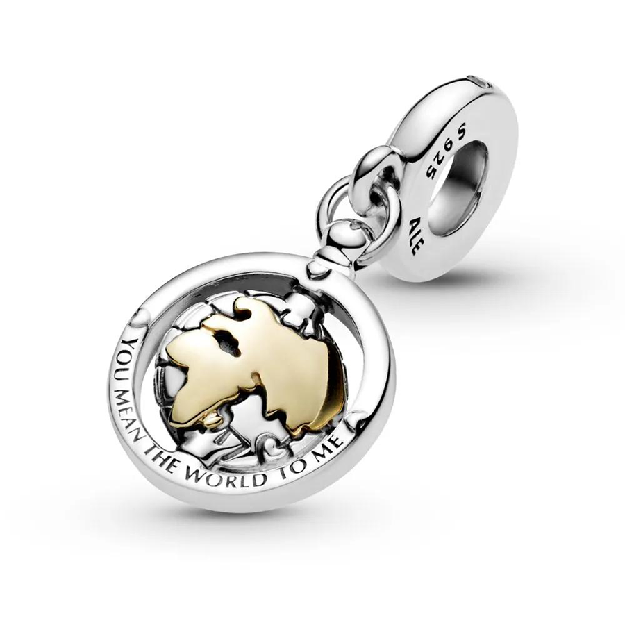 Present your beloved with the Gold Spinning World Charm. Crafted from sterling silver, this exquisite piece showcases a flat spinning globe encased within a circular frame adorned with a shimmering gemstone on the clasp. Delicately etched with longitude and latitude lines, the continents of the globe are meticulously hand-finished in 14k gold. Adorned with tiny raised hearts, the frame bears the heartfelt inscription "You mean the world to me" on the front, while the insignia of the esteemed brand graces the back. Declare your boundless love with this remarkable creation.