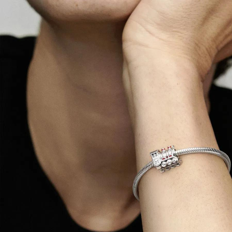 Sterling silver charm featuring the iconic Hogwarts Express train, adorned with intricate red enamel details and engravings such as "Anything from the trolley, dears?" and "9 3/4".