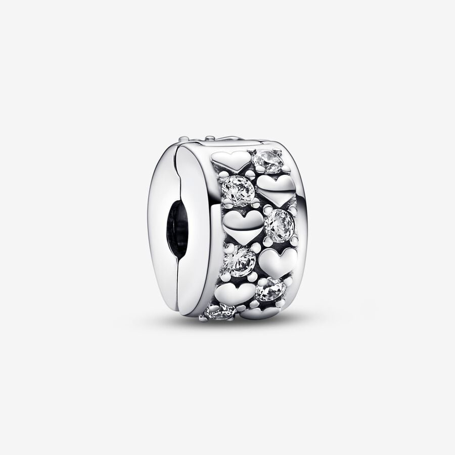 Protect your cherished charms with this emblem of affection. Fashioned from sterling silver, the Hearts Sparkling Clip Charm showcases two rows of embossed hearts adorned with glittering stones, lending an air of sophistication. Attach it to your bracelet to accentuate your preferred charms.