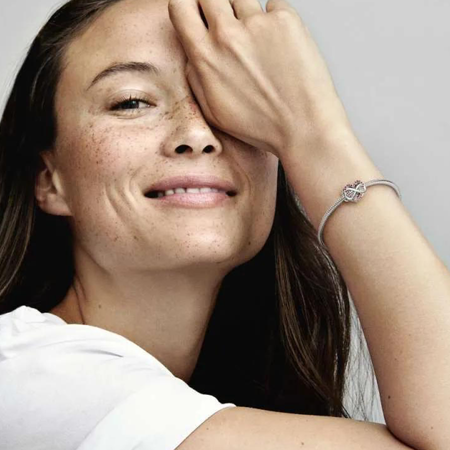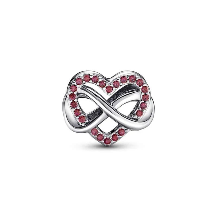 Express "love you forever" with sterling silver and sparkling stones. This openwork charm features an infinity symbol entwining a heart outline, representing the eternal bond that connects families. A constellation of brilliant-cut, red cubic zirconia decorates the heart, adding a vibrant touch. Style this charm on your charm holder and carry reminders of your loved ones wherever you go.