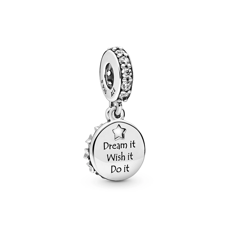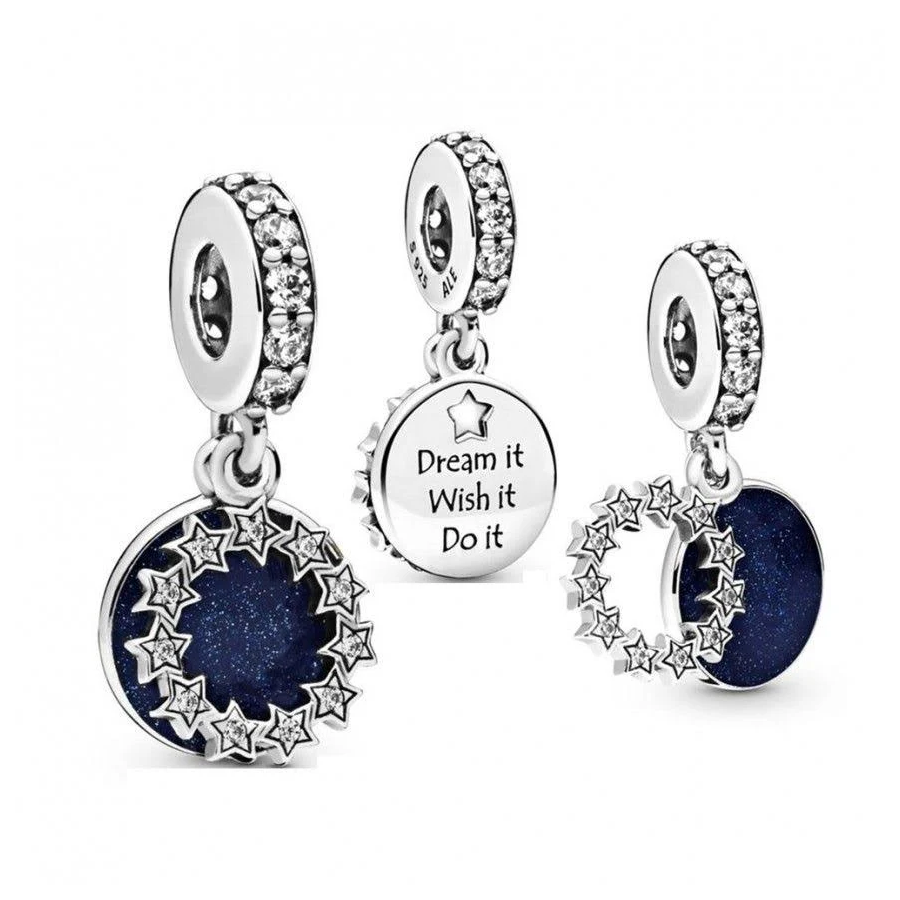 Drawing inspiration from the captivating contrasts found in the night sky, this piece boasts a blue enamel centerpiece encircled by sparkling cubic zirconia stones. Engraved with the empowering message "Dream it, Wish it, Do it," it serves as a constant reminder of your ability to turn aspirations into achievements. Incorporate this charm into your bracelet to carry this motivation with you, encouraging you to relentlessly chase your dreams.