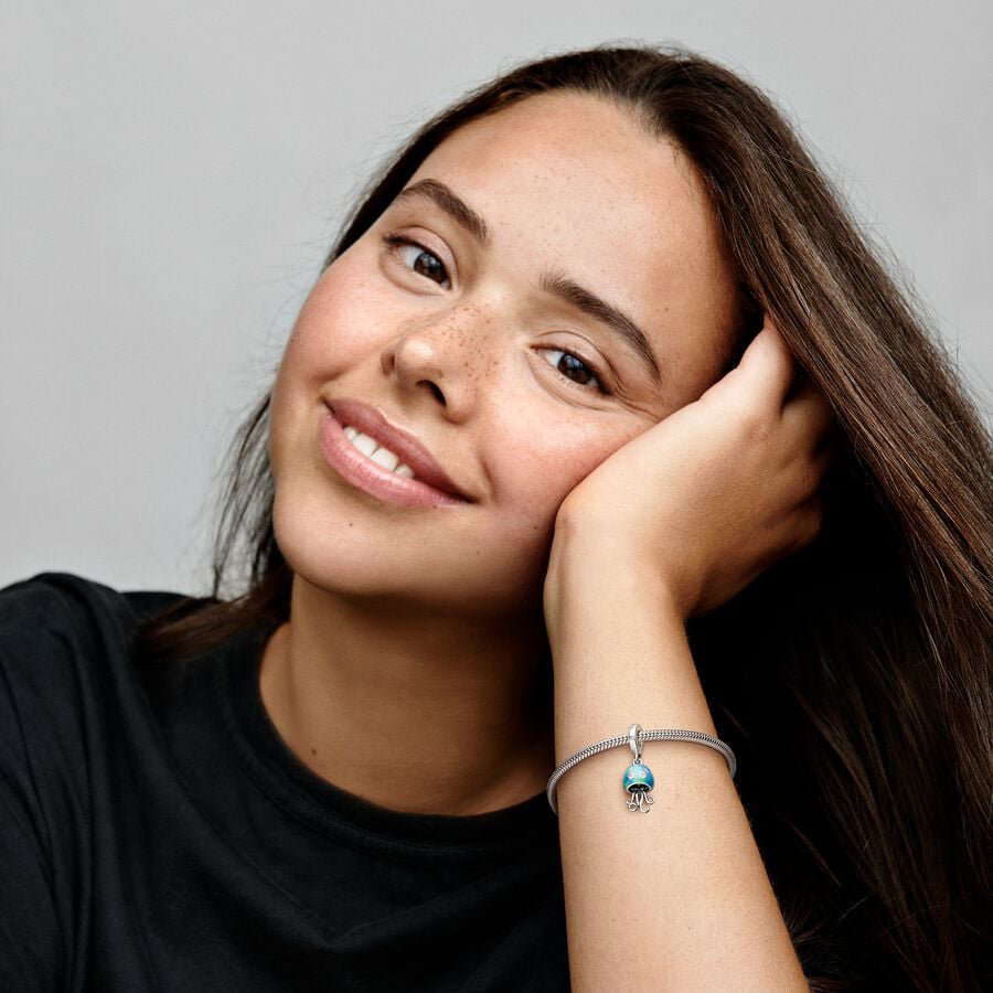 Embrace the depths of the sea with the Color-changing Jellyfish Dangle Charm. This intricately crafted sterling silver charm boasts movable tentacles, shimmering cubic zirconia for eyes, and enamel in varying blue hues, transforming with temperature changes. Inspired by the jellyfish's fluid movement and adaptability, incorporate it into your charm collection as a symbol of embracing transformation and trusting your instincts.