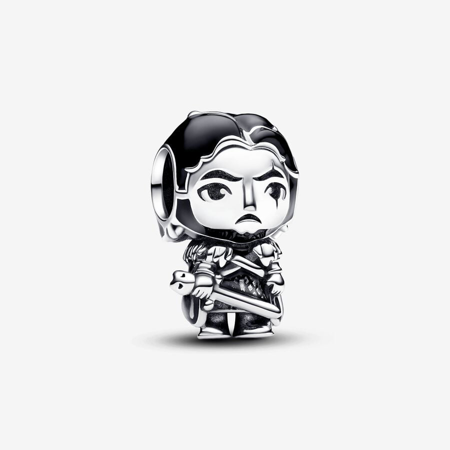Display your allegiance with our Jon Snow-inspired charm. Fashioned from sterling silver, this charm portrays Jon Snow's distinctive features, including his scarred left eye, curly dark hair, and his signature cape trimmed with fur. The intricate details are accentuated with hand-applied enamel, adding depth to the colors. Additionally, Jon is depicted wielding a sword adorned with the Direwolf head, symbolizing his family's steadfast loyalty and bravery. Whether worn in solidarity with the King in the North or bestowed upon a cherished individual, this charm embodies the spirit of resilience and determination.