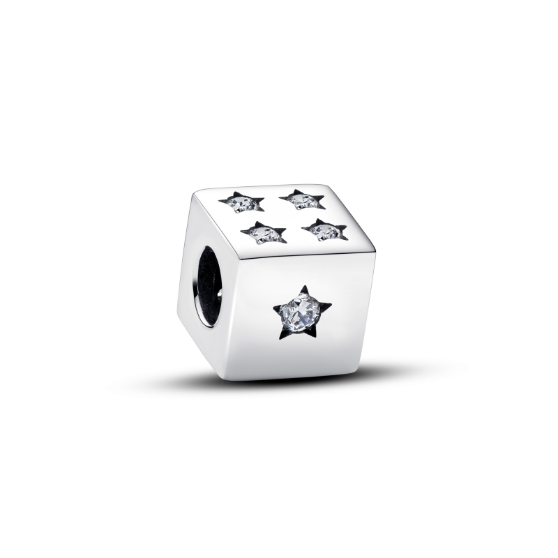 This sterling silver dice charm is a playful tribute to luck and chance, showcasing star-shaped settings on each side, each adorned with a sparkling cubic zirconia. The highly polished surface of the dice creates a sleek, reflective finish that beautifully contrasts with the brilliance of the stones. With its unique design, this charm adds a touch of fun and whimsy to any bracelet, celebrating the excitement of taking risks and the hope for good fortune.