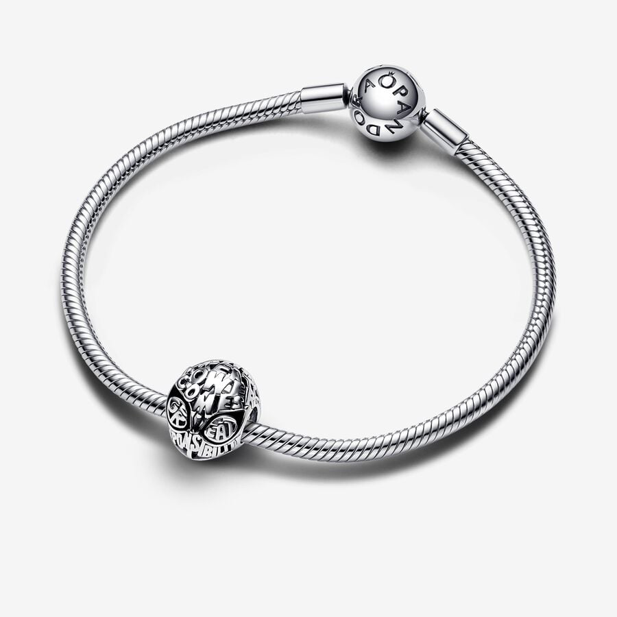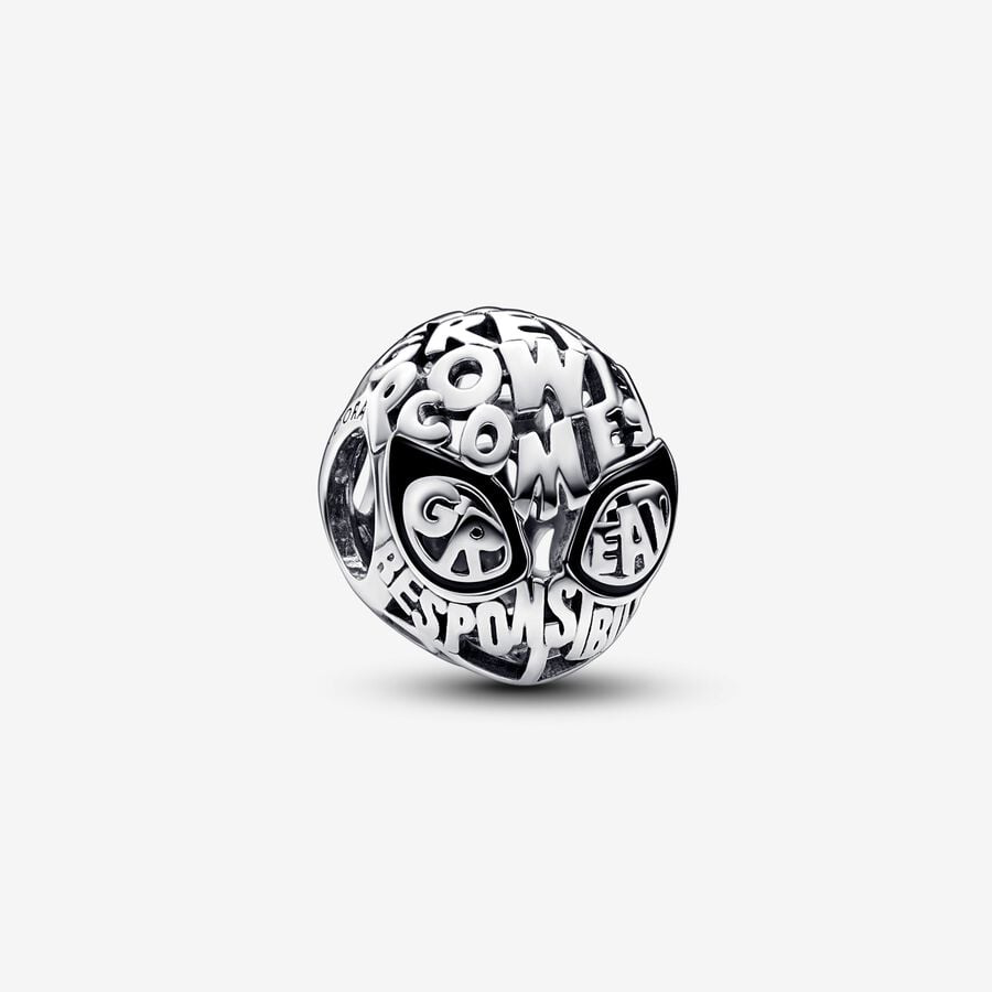 Craft your unique Spider-Man tale with our Spider-Man Mask Charm. Made from sterling silver, this charm depicts Spider-Man's iconic mask, with its front adorned with a graphic font conveying the timeless message "With great power comes great responsibility." Delicate openwork web detailing graces the charm's back, complemented by black enamel eye outlines on the front. Add this charming piece to your bracelets, earrings, or charm holders as a daily reminder of your inherent greatness.