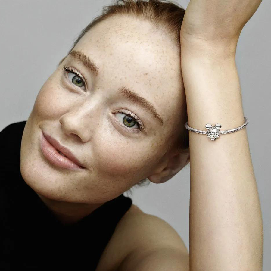 Induce a grin with this adorable portrait charm featuring the iconic Mickey Mouse. Designed for Moments bracelets, it boasts meticulous cubic zirconia detailing for a dazzling touch. Crafted from sterling silver, the charm embodies all the beloved traits of this timeless character, including his signature smile. Whether worn or gifted, it serves as a testament to cherished tales and beloved memories. Note: This clip charm does not include a silicone grip, thus it may slide if not threaded properly onto two raised charm dividers.