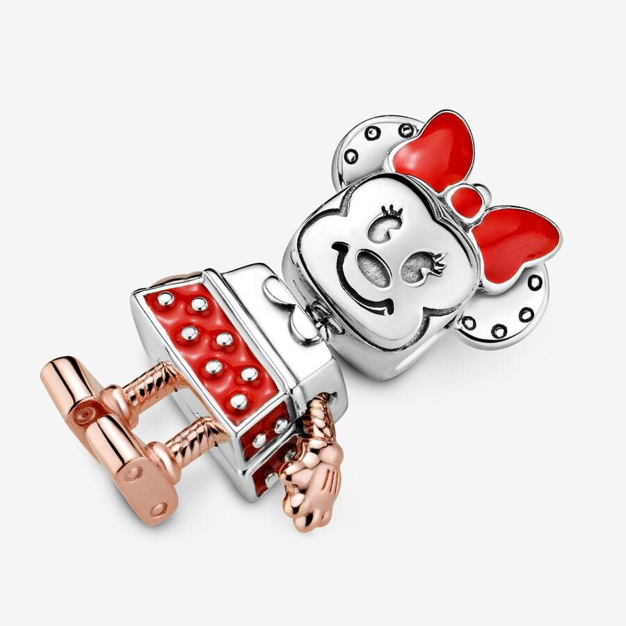 Explore the Minnie Mouse Robot Charm inspired by a beloved animated character, crafted in sterling silver and a unique metal blend of rose gold plating. This innovative design presents Minnie with robotic elements, featuring a movable body in sterling silver and robotic arms and legs in the Pandora Rose metal blend, adorned with subtle snake chain textures. Delight in the intricate screw-inspired accents adorning the ears, antenna, and a charming red enamel bow atop the head. Combine this charm with its counterpart, the Mickey Mouse Robot Charm, to create an enchanting pair on your Pandora Moments bracelet.