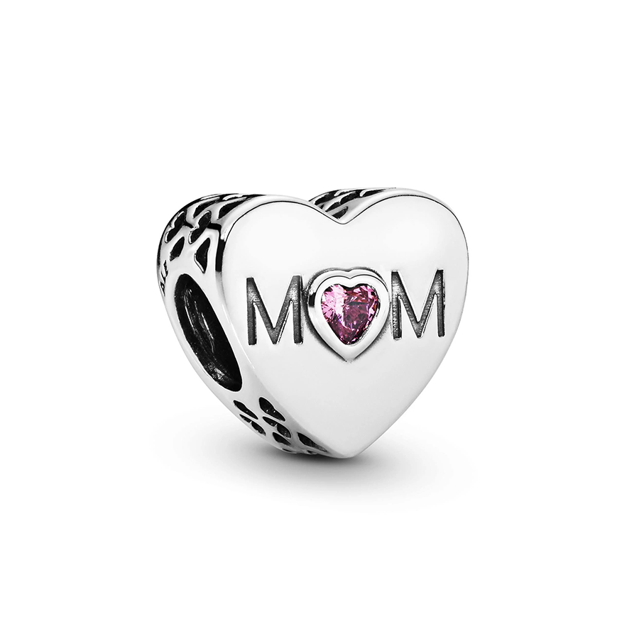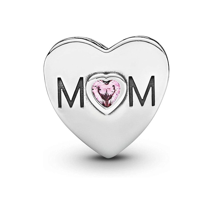 This elegant charm features a heart-shaped design with a soft pink stone nestled between two delicate 'M's. Crafted to celebrate motherhood, it symbolizes enduring love and cherished memories. With its subtle sparkle and intricate detailing, it's a beautiful addition to any charm bracelet, perfect for honoring a special bond.