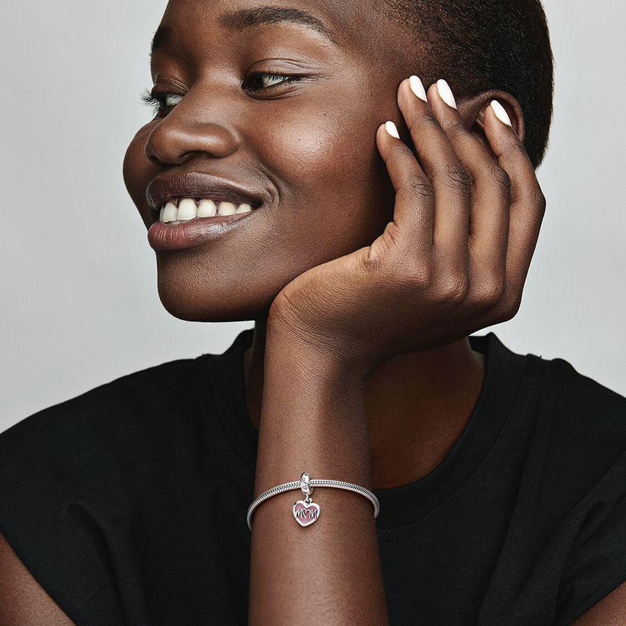 Show your mom just how much she means to you with this sterling silver double dangle charm. The back dangle is adorned with a soft pink enamel finish, while the front disk showcases a delicate openwork script that spells "mom" with a charming heart detail. Sparkling fairy tale pink cubic zirconia stones accent the bail, adding a touch of elegance. An engraving on the back dangle reads "I love you," making this piece a heartfelt gift for the mother figure in your life.