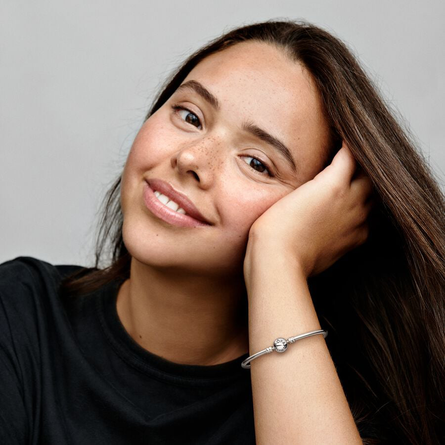 Elegant and refined, this Moments bangle exudes beauty. Fashioned from lustrous sterling silver, it features an embossed ball clasp for a touch of sophistication. Wear this bangle alone for a stunning look, or customize your bracelet by incorporating your own assortment of Moments charms.