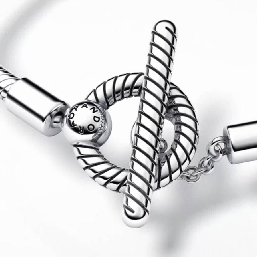 Expand your collection with the Moments T-Bar Snake Chain Bracelet. Handcrafted in sterling silver, this bracelet offers a modern twist on the classic snake chain design. With its T-bar double circle closure, ensure a secure clasp by looping the T-bar through the smaller circle. Adorned with a snake chain pattern on its rigid segments, this bracelet accommodates up to 15-20 Moments charms and dangles.