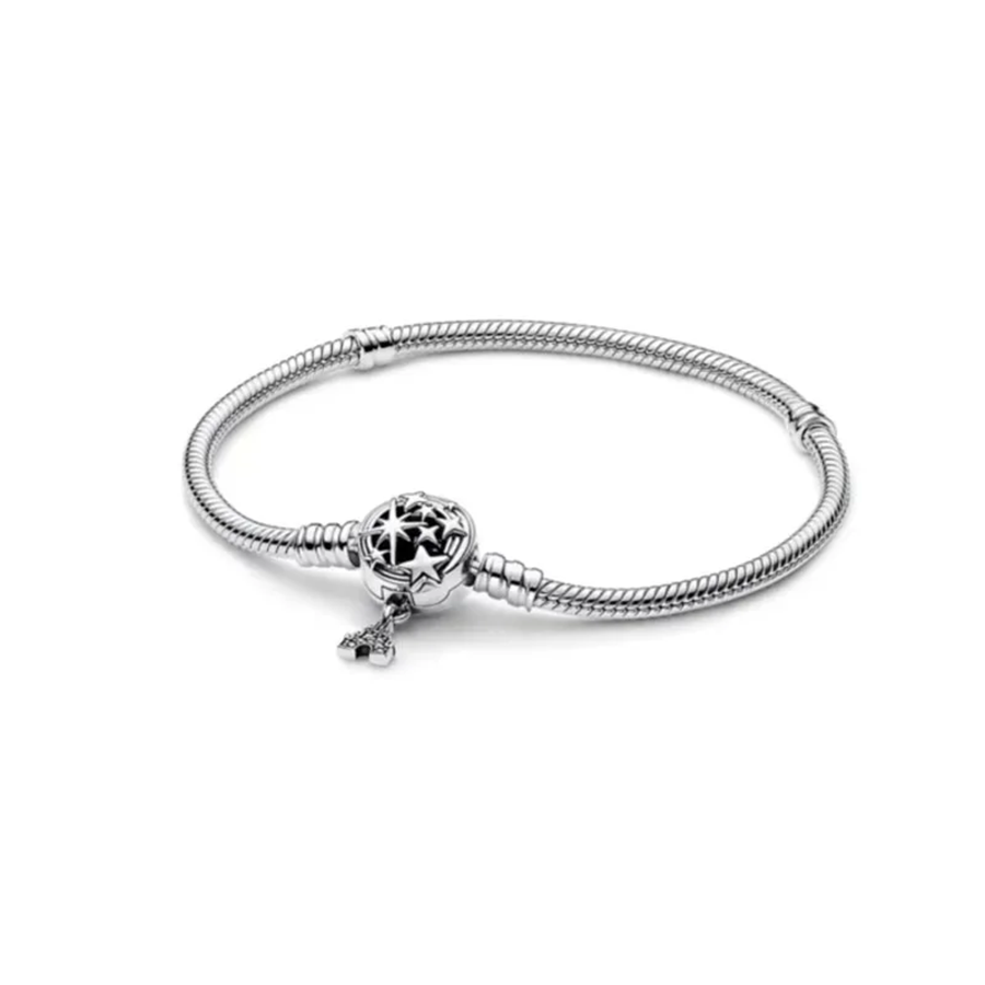 Introducing a sterling silver bracelet adorned with a captivating Disney Parks clasp. The centerpiece of this enchanting piece is a dangling Disney castle charm delicately suspended from the clasp, adding a touch of magic to your wrist. Crafted with precision and attention to detail, this bracelet exudes elegance and charm, making it a perfect accessory for any Disney enthusiast. Wear it alone as a statement piece or pair it with your favorite Disney charms to create a personalized and whimsical look that celebrates the magic of Disney.