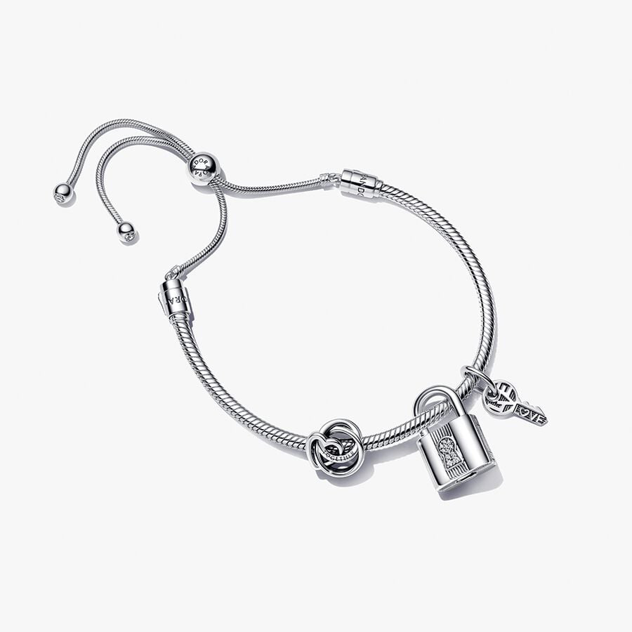 This exquisite snake chain bracelet offers a refined twist on the timeless friendship bracelet. Expertly crafted in gleaming sterling silver, it boasts a movable and a fixed end cap, each adorned with sparkling stones. Its ingenious sliding clasp allows effortless customization to fit your wrist perfectly. An ideal gift for cherished ones, this bracelet can be personalized by lifting the movable end cap and incorporating your preferred charms.