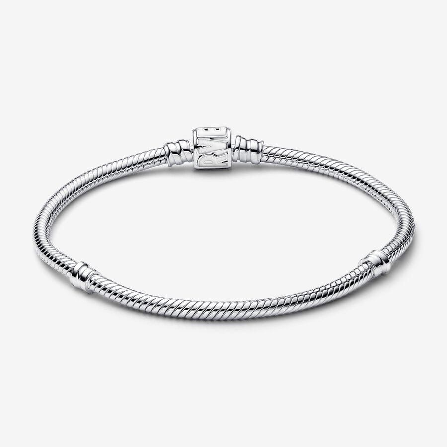 Assemble your ideal squad. Handcrafted in sterling silver, this renowned bracelet showcases our distinctive snake chain design and a Marvel brick clasp adorned with subtly raised letters in white enamel. Accommodating up to 18 charms, hanging charms, or pendants, it's effortless to personalize. Just attach a clip charm on each thread to segment it into three sections, then select your preferred hero charms. Embrace our Moments Marvel Clasp Snake Chain Bracelet as a daily inspiration to unleash your strength.