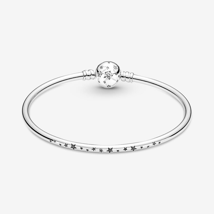Captivated by the night sky's allure, the Moments Stars & Galaxy Bangle infuses celestial radiance into your ensemble. Crafted meticulously in sterling silver, its clasp resembling a sphere showcases intricately engraved stars and sparkling cubic zirconia stones, while the reverse side of the band also boasts celestial engravings. Accommodating up to 16-18 Moments charms and dangles, this accessory harmonizes flawlessly with other cosmic-themed adornments, ensuring an ensemble that transcends earthly realms.