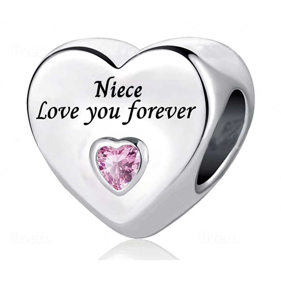 The Niece Love You Forever Charm is a beautiful, heart-shaped piece made from high-quality sterling silver, designed to show your enduring love. This elegant charm fits perfectly on most bracelets, adding a personal and sentimental touch to any collection. The charm is adorned with a delicate pink heart-shaped sparkling stone at its center, symbolizing affection and warmth. Its timeless design and thoughtful engraving make it the perfect gift to celebrate the special bond between you and your niece, ensuring she will carry a reminder of your love wherever she goes.