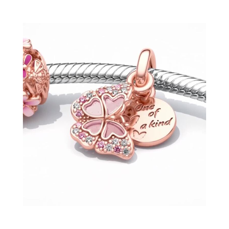 Embrace transformation with our Pink Butterfly Charm. Hand-finished in 14k rose gold plating, it showcases a butterfly intricately adorned with transparent pink enamel within heart-shaped cut-outs on each wing, complemented by shimmering pavé along the borders. Honoring the exquisite individuality of each butterfly, a circular disc is etched with "One of a kind" on one side and delicate fluttering butterflies on both sides. Pair this dual dangle charm with other pieces inspired by spring to herald the season of fresh starts.