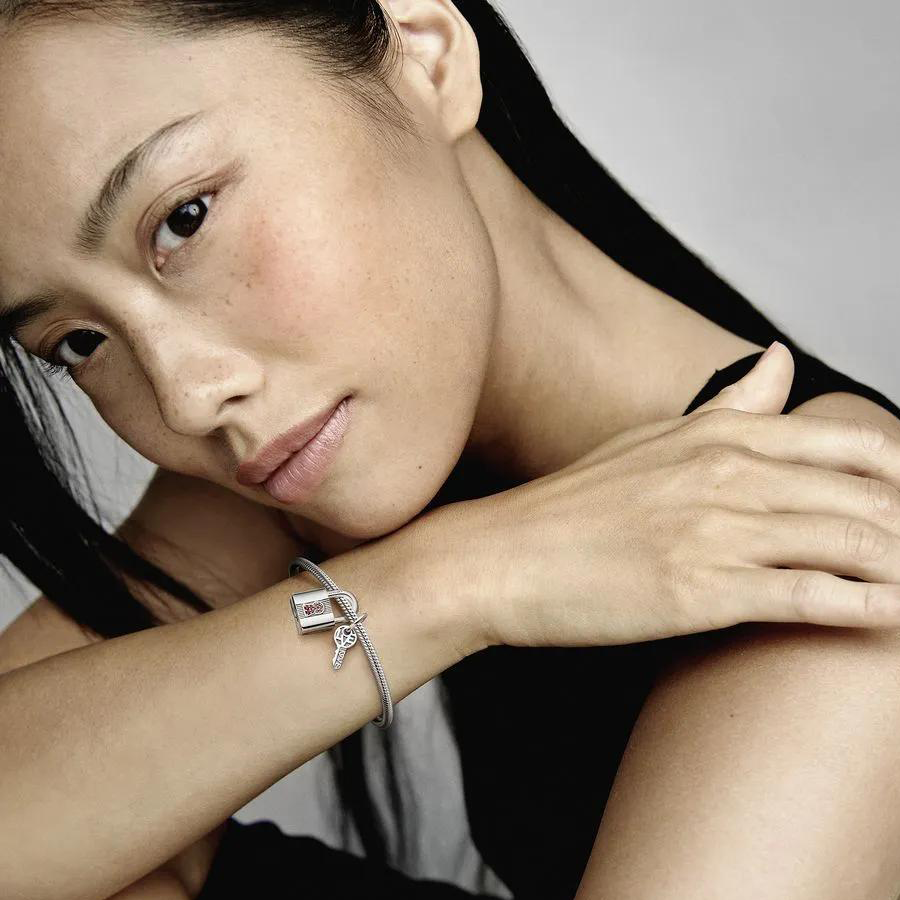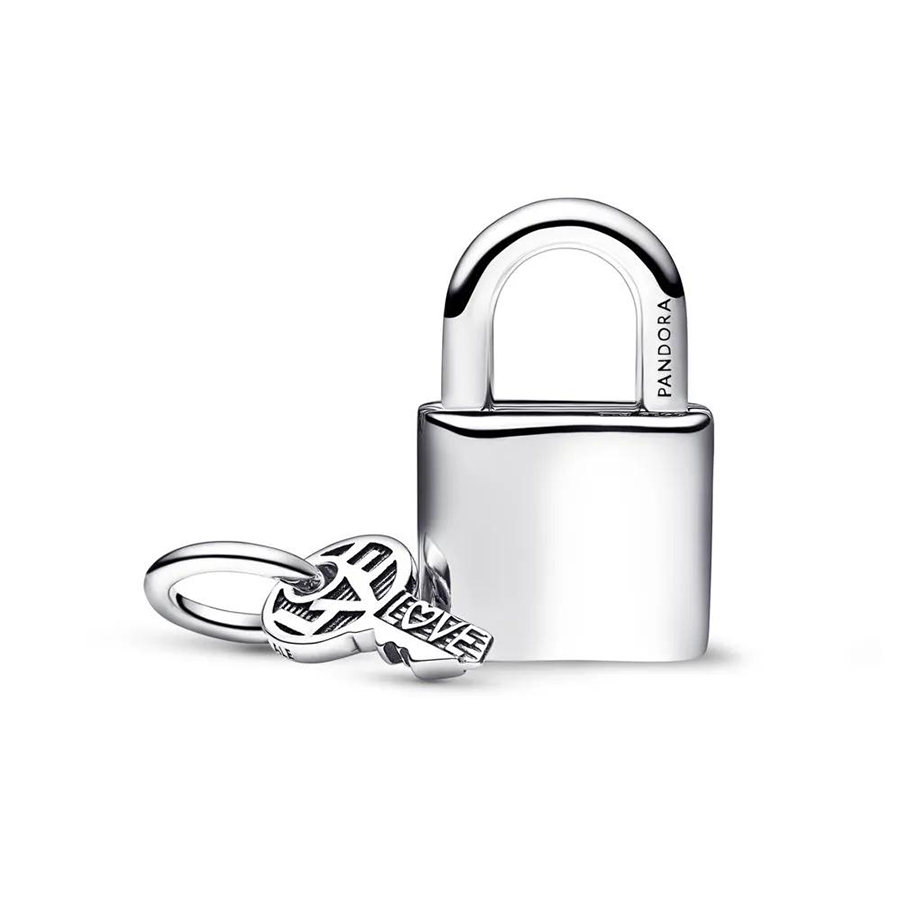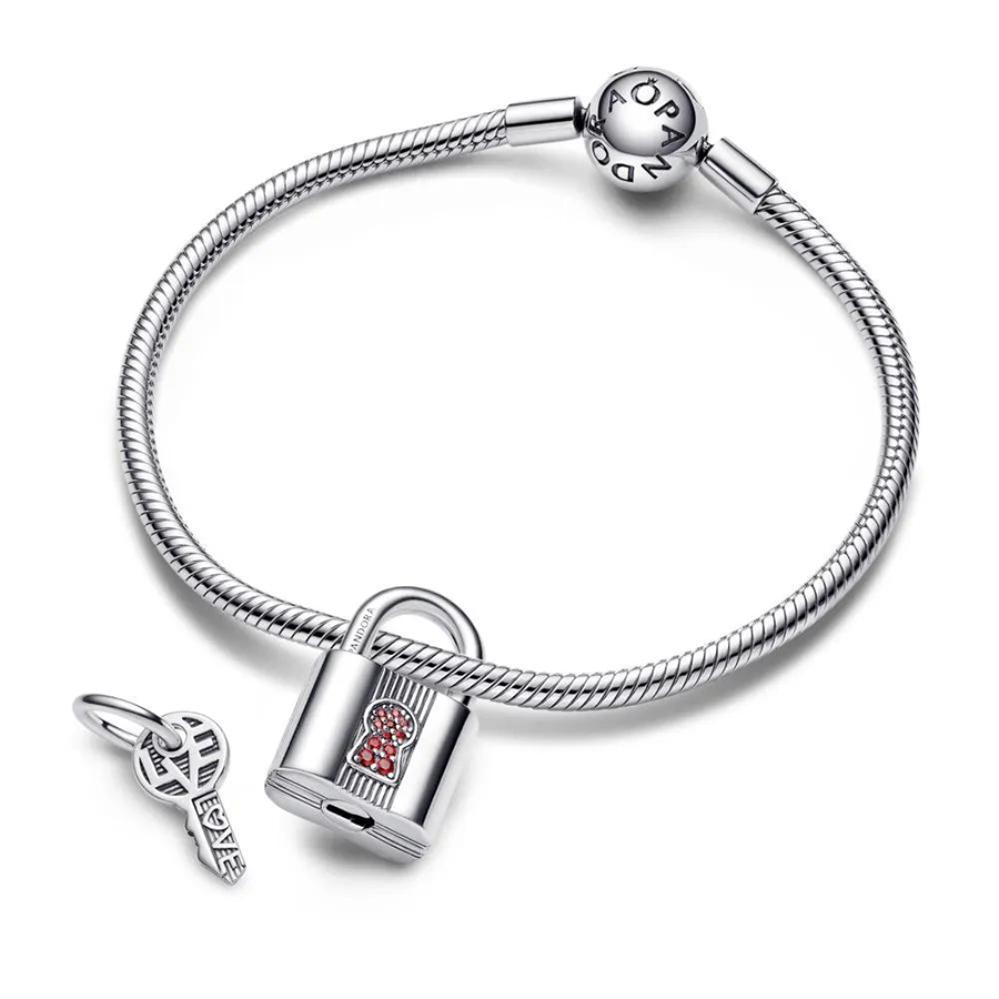 Drawing inspiration from the tradition of love locks adorning bridges worldwide, this sterling silver Padlock & Key Red Crystal Charm encapsulates romance. Embellished with red man-made crystals in its keyhole, and adorned with the engraving "Love" on the key, it is a symbol of affection. Comprising two distinct pieces, the key doubles as a standalone charm. Whether placed alongside the padlock for a cohesive look or presented as a heartfelt gift, this charm signifies the exclusive ability of a cherished one to unlock your heart. It is important to refrain from wearing the key inside the padlock.