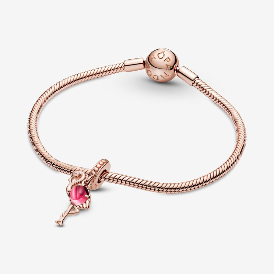 Indulge in a daily retreat to paradise with the Pink Flamingo Charm. Crafted with meticulous detail in 14k rose gold plating, this charming piece showcases a captivating pink Murano glass stone at its core, complemented by endearing hearts adorning the bail. Delicately crafted, the charm captures the intricate beauty of a flamingo's feathers, visible through the translucent glass. Allow the soothing hues and serene atmosphere of this charm to whisk you away to a verdant sanctuary, no matter where you find yourself.
