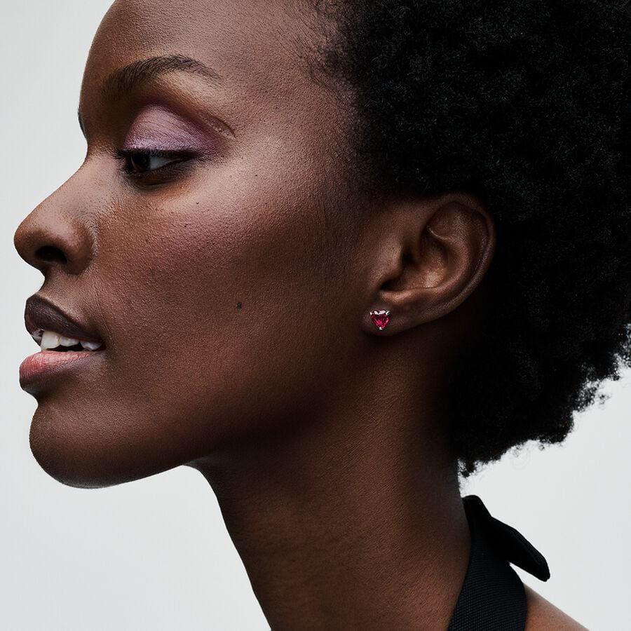 Enhance the romantic allure with our Red Heart Stud Earrings. Faceted red man-made crystals in a heart shape shimmer within a sterling silver three-prong setting. Make a bold declaration of love by combining this set with other heart-themed accessories.
