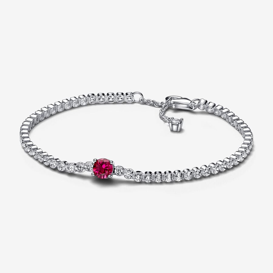 Elevate your attire with the Red Sparkling Round Pavé Tennis Bracelet. Fashioned from sterling silver, this tennis bracelet showcases a prominent central round brilliant-cut man-made crystal in a striking rich red hue, encircled by a border of clear cubic zirconia pavé. Equipped with a lobster clasp for secure fastening, it offers versatility with adjustable length settings. Wear this exquisite piece alone or complement it with other dazzling timeless jewelry for a standout ensemble.