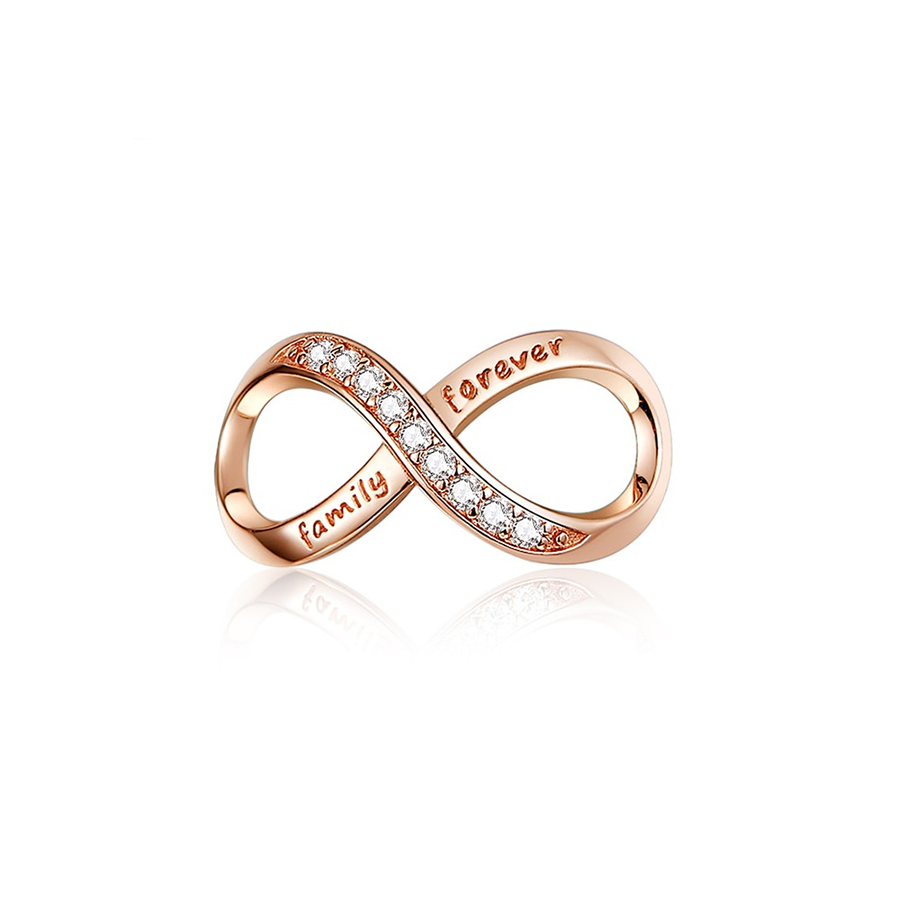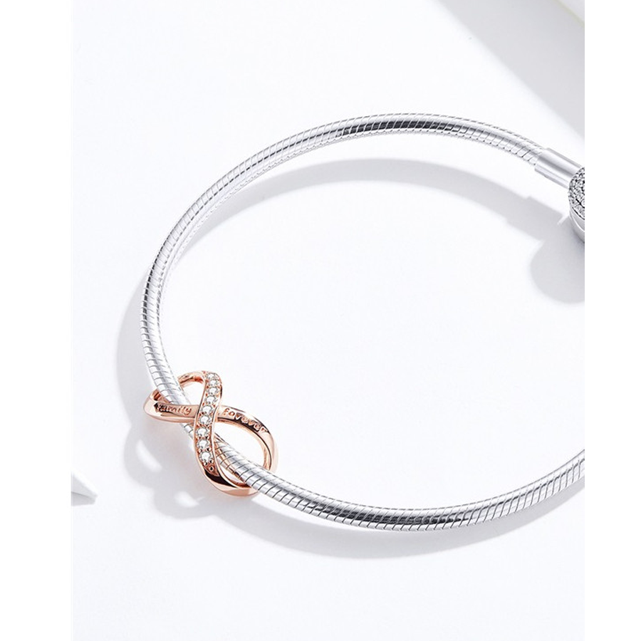 Indulge in this exquisite Rose Gold Family Forever Infinity Charm. It represents enduring love, shimmering in sterling silver adorned with clear cubic zirconia for extra brilliance. Drawing inspiration from the maternal bond, the infinity symbol resonates with your deepest emotions. It seamlessly transitions between bracelet charm and necklace pendant, offering versatility and elegance.
