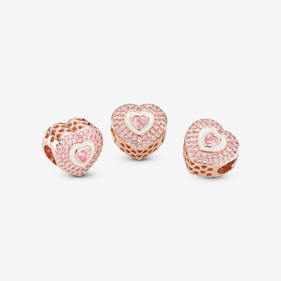 Embracing the timeless symbol of affection, hearts grace our collections as a tribute to various forms of love. This charm, adorned with pink pavé hearts, is delicately plated with 14k rose gold. Crafted with heart-shaped crystals and meticulously applied enamel, its enchanting design imbues romantic hues into your ensemble. Pair it with other charms that resonate with your personal journey, crafting a style that embodies your unique essence.