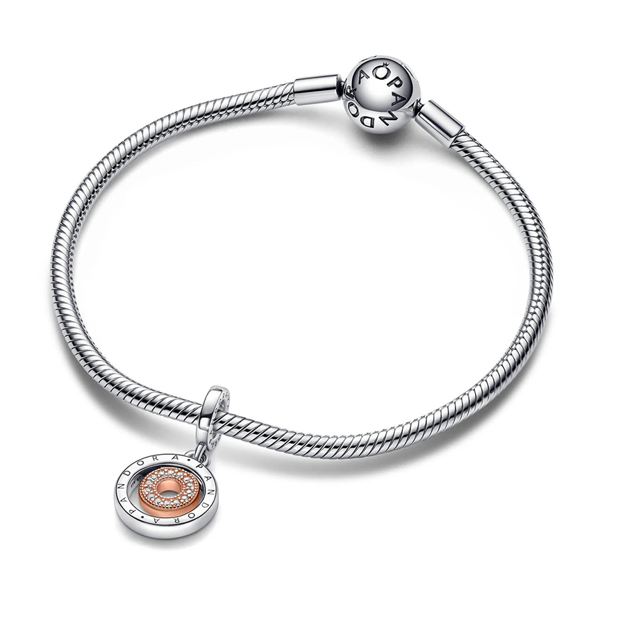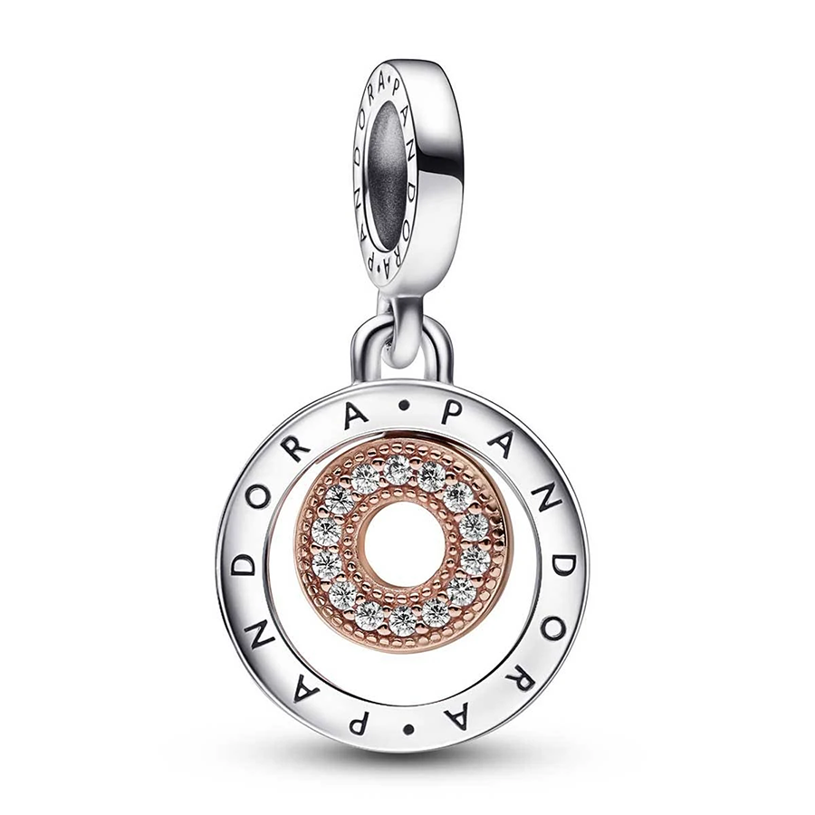 This charm presents itself as a sophisticated and attention-grabbing complement to your charm bracelet or any other themed accessory. Its distinctive and inventive construction, featuring a 14k rose gold plated metal alloy circle adorned with sparkling pavé, renders this piece truly distinctive and captivating. The emblematic logo etched onto the larger circle in Sterling Silver imbues the charm with an air of sophistication and grace.