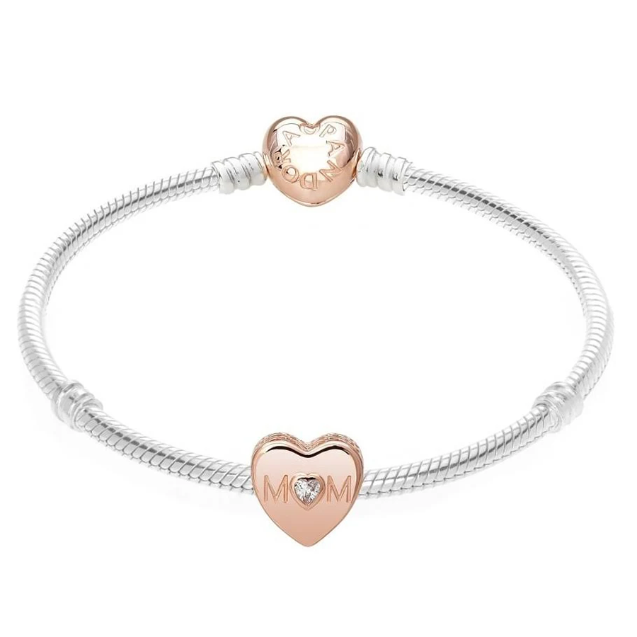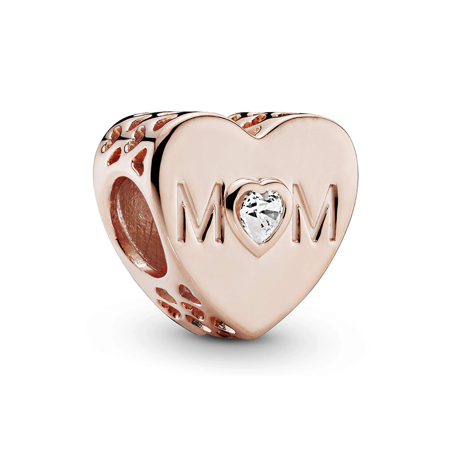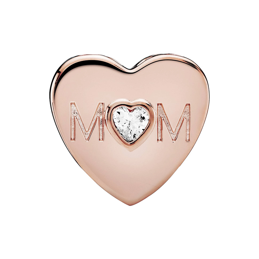 Honor your special connection with mom with this rose gold charm. Fashioned from our distinctive 14k rose gold-plated metal mixture, this charm bears the inscription "Mom" to acknowledge the paramount figure in your life. Enhanced by a heart-cut cubic zirconia stone, this jewel exudes elegance and allure, while its transparent hue ensures effortless coordination with any ensemble.