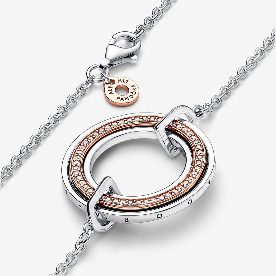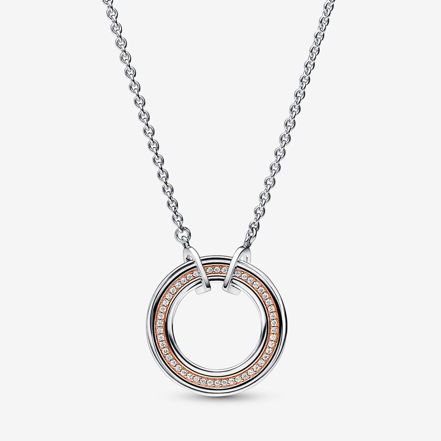 Embrace completeness with Rose Gold Two Tone Pavé Necklace. Handcrafted in sterling silver, this chain necklace showcases a dual-tone circular pendant with a square silhouette in our exclusive 14k gold-plated alloy. The pendant, which can be rotated, is adorned with a line of pavé stones set within a groove on its front side and a protruding circle on its smooth back. Its sleek and understated design lends itself to layering with other chain necklaces for a dynamic ensemble, or it can be worn solo for a refined aesthetic.