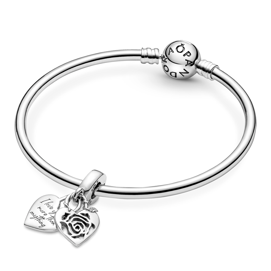 Always keep love close with this Rose Heart Padlock Charm. Hand-finished in sterling silver and engraved with the words "I love you more than anything," this romantic charm features a heart-shaped padlock with a rose cut-out design, inspired by love lock bridges around the world. Gift it to someone special as a symbol of your affection, or add it to your own collection as a reminder that love can bloom anywhere.