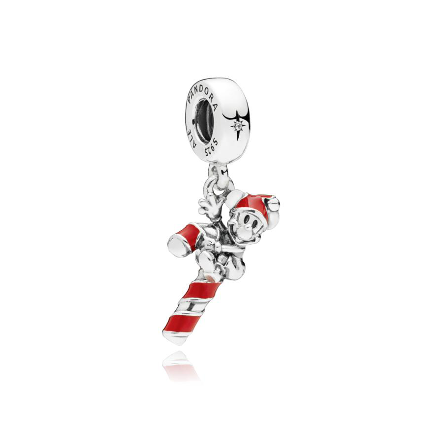 Experience the enchantment of the holiday season with this delightful striped dangle charm crafted from sterling silver and adorned with red enamel. Embellished with a candy cane motif, it portrays Mickey Mouse embodying the spirit of Father Christmas.