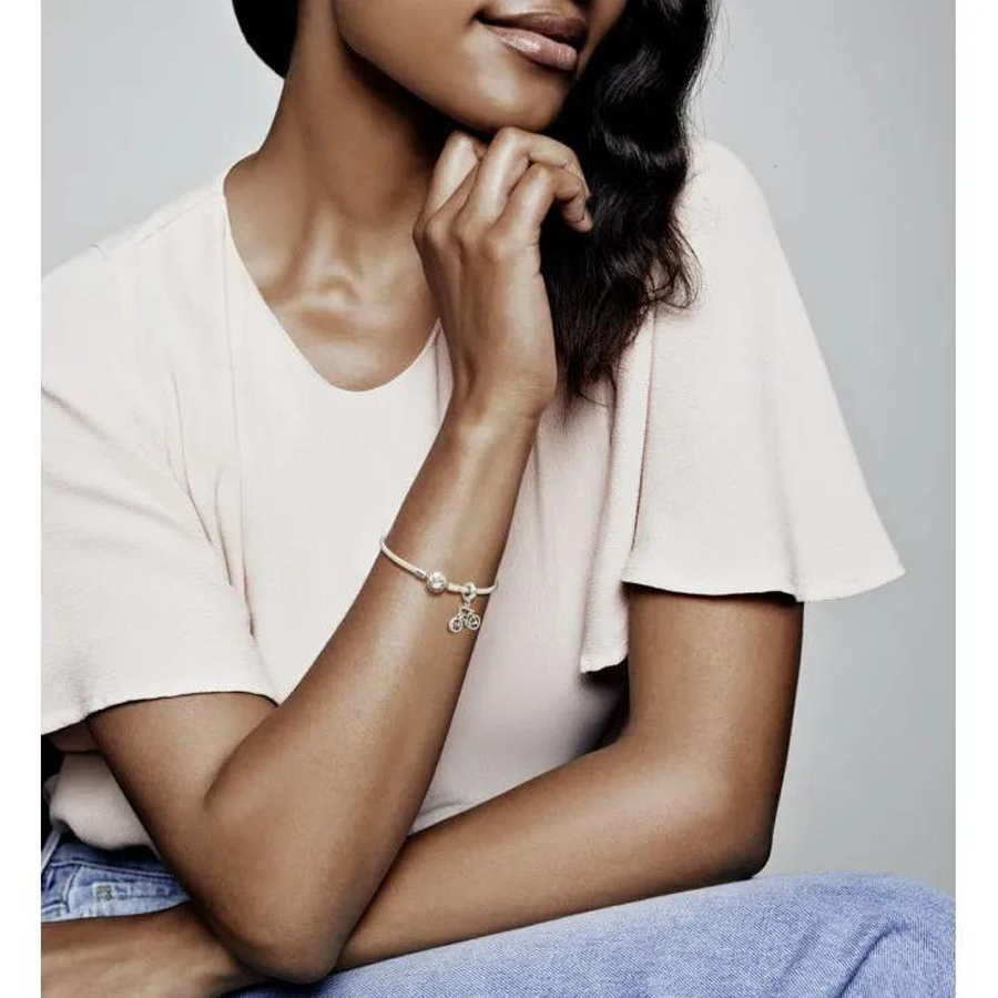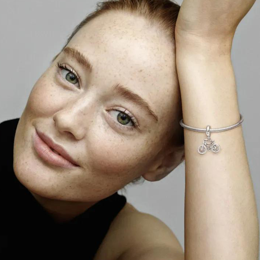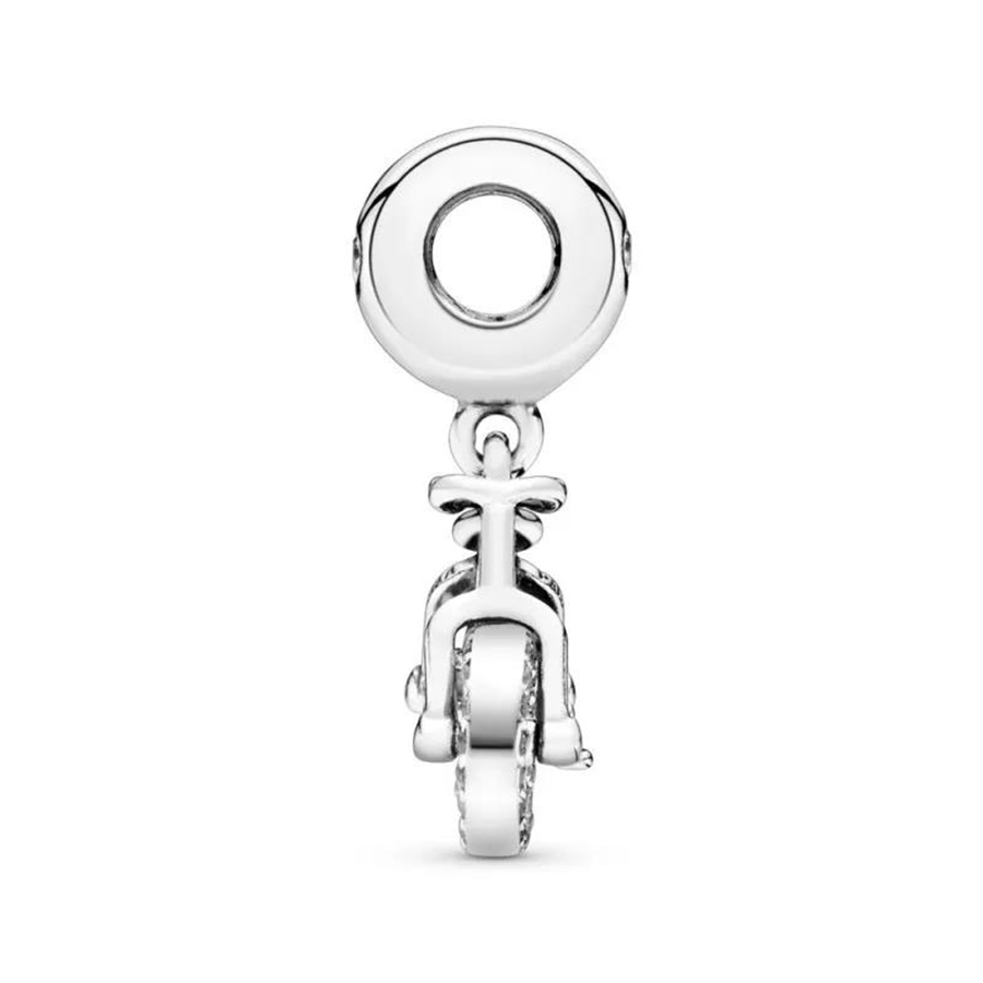 Express your passion for cycling with this exquisite sterling silver bicycle charm. Adorned with intricately designed wheels embellished with rotating stones, it adds a touch of graceful motion to your ensemble, elevating your cycle style to new heights.