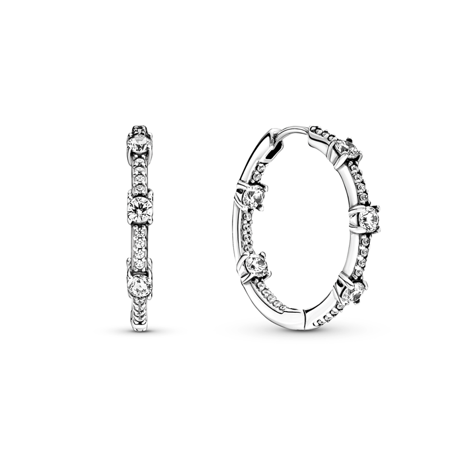 Exuding sophistication and elegance, these exquisite Sparkling Pavé Bars Hoop Earring captivate with their delicate design. Handcrafted in sterling silver, the earrings showcase a row of shimmering clear cubic zirconia pavé, accentuated by five larger individual stones placed at varying heights. The pavé detailing extends halfway around the exterior and interior of the hoop, ensuring maximum visibility and sparkle from every angle. Drawing inspiration from the timeless allure of tennis bracelets, these versatile hoops are a perfect addition to any ensemble.