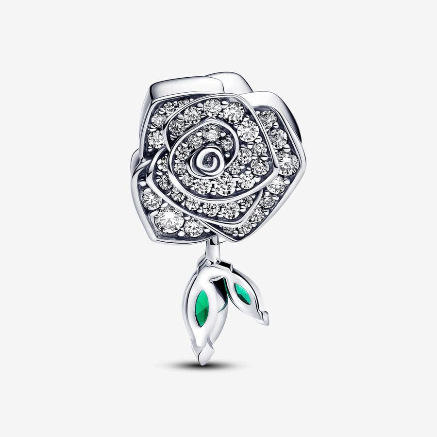 Embrace the floral elegance of our Sparkling Rose in Bloom Charm, a symbolic piece crafted in sterling silver. Intricately designed to capture the delicate nature of the flower, the charm showcases a layered petal effect that reflects the beauty of a blooming rose, adorned with sparkling pavé. Adding lifelike detail and movement, two green stones dangle beneath the flower to represent leaves. Perfect as a gesture of love for someone special or as a meaningful addition to your collection, this charm is sure to keep the romance alive.